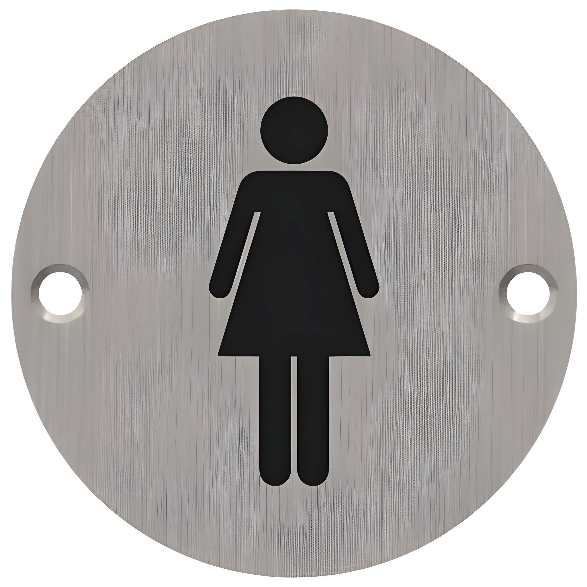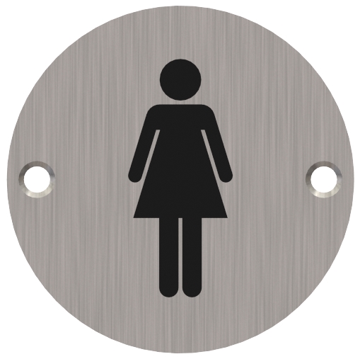 The 371 Series signage is from the Hager Euro product line, 75mm diameter x 1.6mm thick, black symbol on corrosion resistant 304 stainless steel plate with a three year warranty. Packaged with flat head self tapping wood screws.