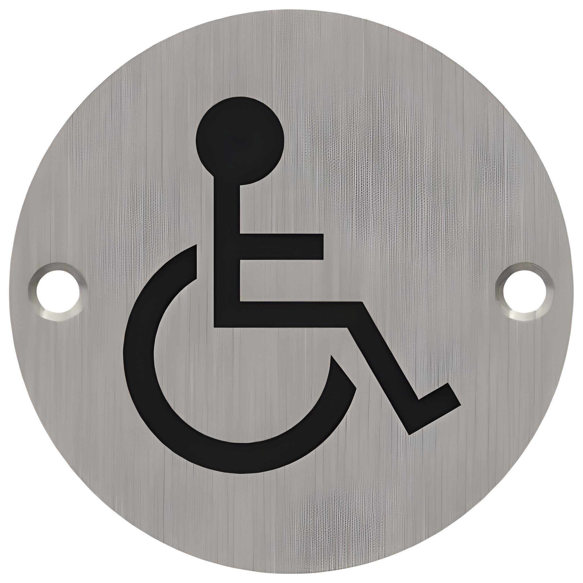 The 371 Series signage is from the Hager Euro product line, 75mm diameter x 1.6mm thick, black symbol on corrosion resistant 304 stainless steel plate with a three year warranty. Packaged with flat head self tapping wood screws.