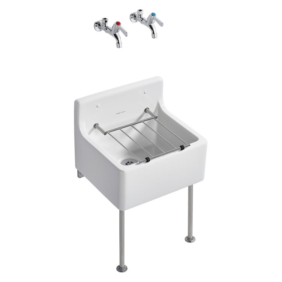 Birch laboratory and cleaners sink in fireclay, for use in laboratories, public buildings and schools with 152mm high back splash and hinged stainless steel bucket grating. Legs and bearers are a commonly chosen option to build-in aluminum alloy bearers. Heavy duty sink, Cleaners’ fittings option, Institutional applications, Two sizes available