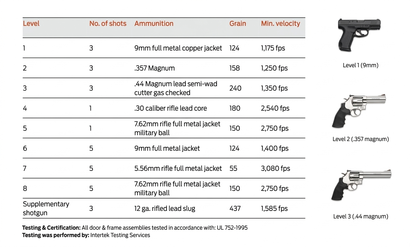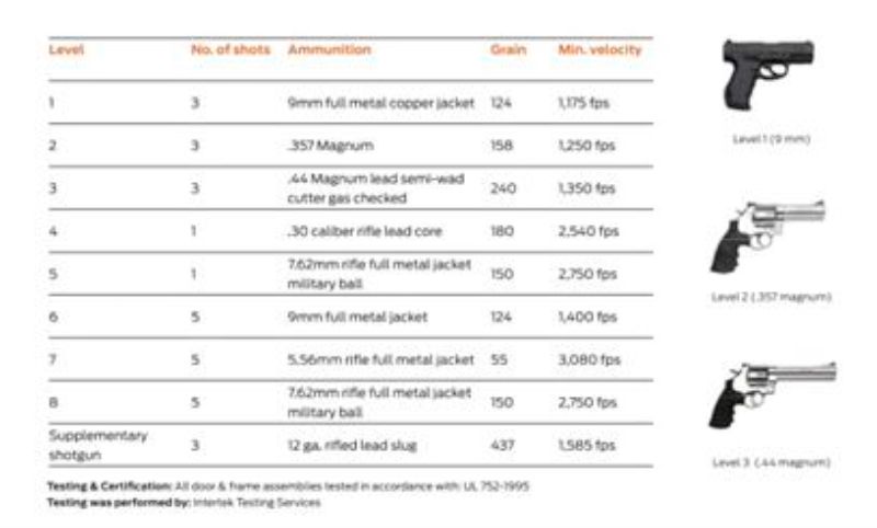 Are available in 8 levels of bullet resistance, ranging from 9 mm handguns (Level 1) up to 7.62 mm military assault rifles (Level 8). All bullet-resistant doors are tested and labeled in accordance with UL752 and constructed per SDI Level 4.