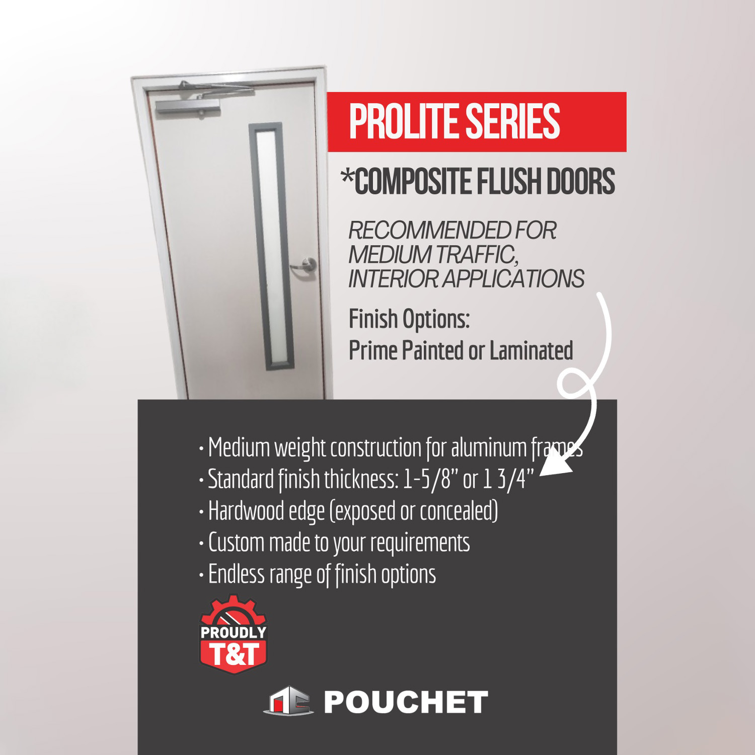 Proudly manufactured in Trinidad and Tobago, the ProLite Series composite flush doors are recommended for high traffic, interior use applications, where a lightweight, solid construction door is required. They are ideal for any internal space, to be hung in aluminium or wooden frames within a gypsum wall opening. These doors are truly versatile as they are custom made to fit any opening and may be painted or laminated in any colour and can be installed in any orientation.