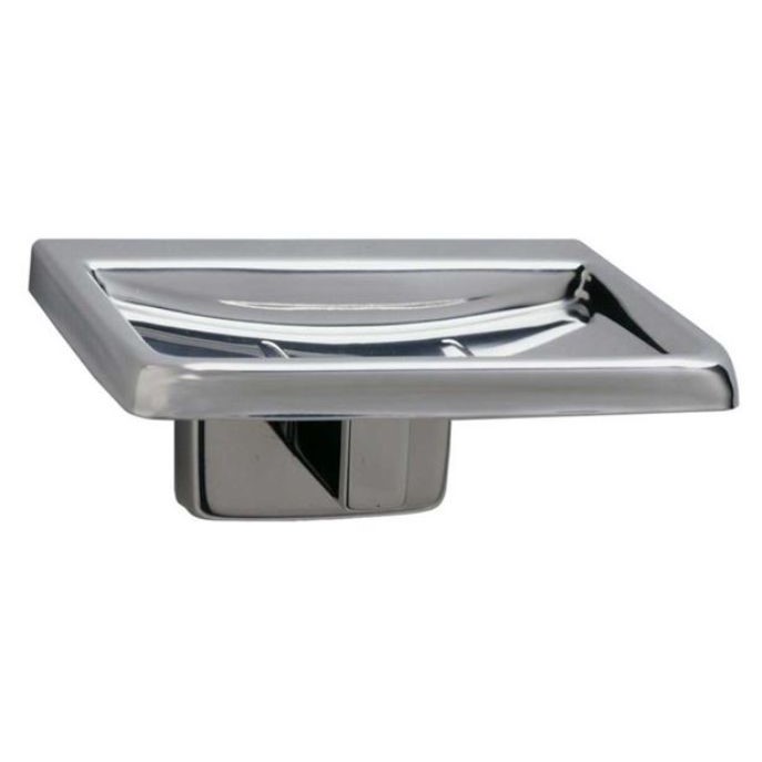 Stainless steel. Drawn, one-piece soap dish welded to support arm and flange. Two ridges hold soap; two drain holes. Unit 4 1/4″ W, 2″ H (110 x 50mm); projects 3 3/8″ (85mm) from wall.